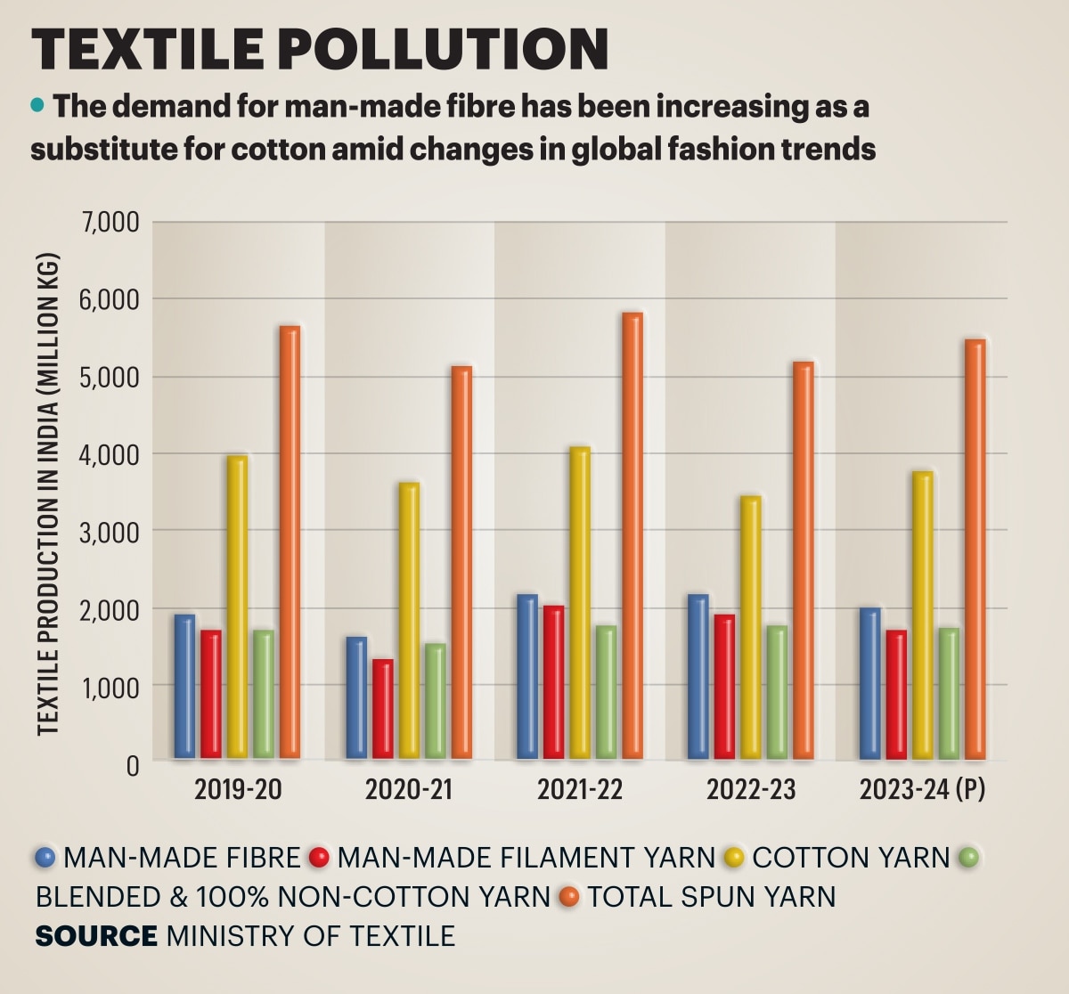 The demand for man-made fibre textiles, which includes materials such as polyester, acrylic, viscose fibre and modal, has been increasing globally, as a substitute for cotton amidst changes in global fashion trends. At present, man-made fibre dominates global textile fibre consumption with a 72% share.