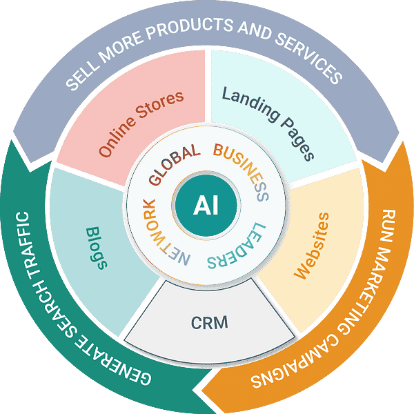 Sell More Products and Services Online Stores Landing Pages Websites Run Marketing Campaigns CRM Generate Search Traffic Blogs Artificial Intelligence Global Business Leaders Network